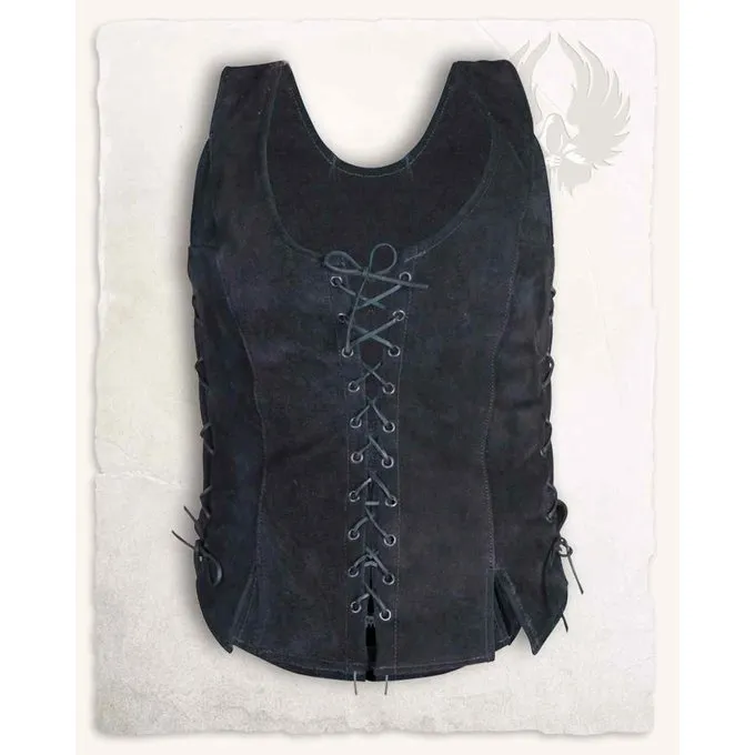 This beautiful suede bodice can be tied at the front and at the sides. Therefore, it favorably accentuates the wearer’s body. The inserted boning gives it extra stability and the slits at the bottom provide a decorative hemline. It goes very well with blouses and skirts, but can also be worn on its own on warm days.