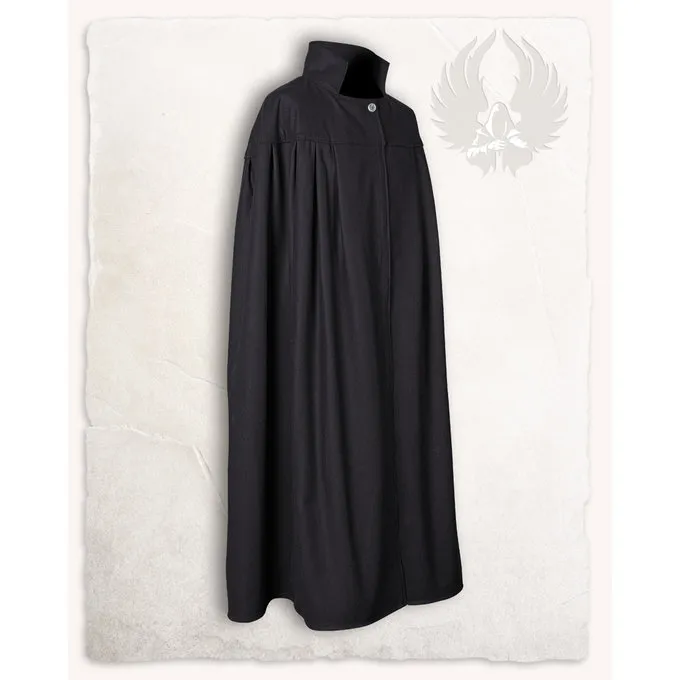This cloak is suitable for reenactment, cosplay and LARP. The cloak is made of wool. It is wide-cut and has a stand-up collar. The cloak can be closed with the button at the front. It has a split at the back, so that the wearer has extra freedom of movement during active movements.