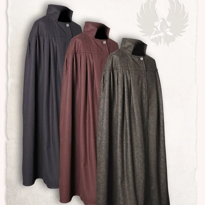 This cloak is suitable for reenactment, cosplay and LARP. The cloak is made of wool. It is wide-cut and has a stand-up collar. The cloak can be closed with the button at the front. It has a split at the back, so that the wearer has extra freedom of movement during active movements.