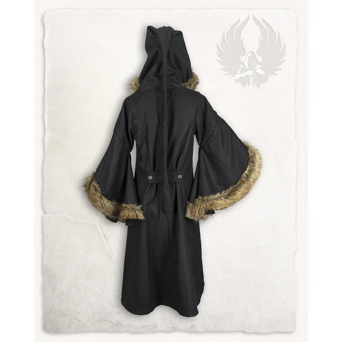 This coat has a unique design and can be worn in everyday life, but also to festivals or at LARP. The coat is designed in fantasy style and the sleeves and hood are decorated with faux fur. It has a long hood in medieval style that protects you from the rain, you can also wear it as a scarf. The elegant wide sleeves and tight-fitting waist make this a beautiful coat. The coat can be closed with a row of buttons at the front, and with buttons on the back you can determine how tight the waist will fit.