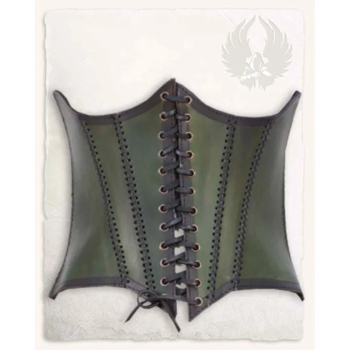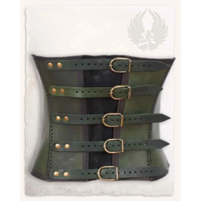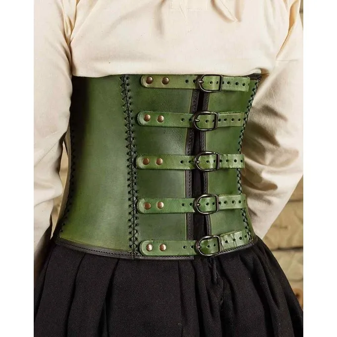 This corset is made of high quality molded upper leather and fits perfectly to the body of the wearer. The size and fit can be individually adjusted by means of the lace-up closure at the front and the buckles at the back. The corset can be combined with many different blouses and shirts. Perfect for a LARP gathering or medieval festival.