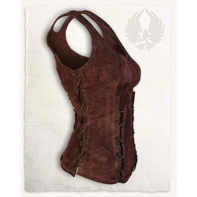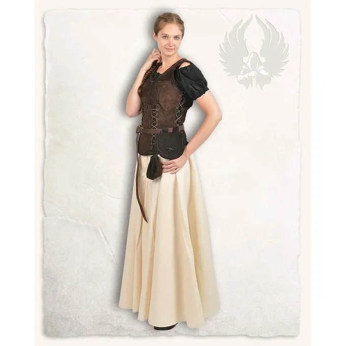 This corset has a suede body and has lacing on both sides at the front and back to emphasize the waist individually. It opens and closes on the sides. So you can quickly slip in and out again. The bodice can be easily combined with our cotton blouses and skirts and adapts to your own body thanks to the lacing.