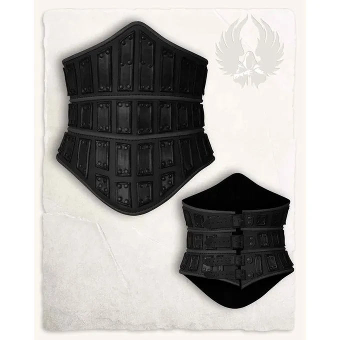 The Evandra corset is made of comfortable soft upper leather and closes at the back with three buckles. The piped seams at the bottom, top and the two in the middle give a nice accentuation to the waist. The riveted leather scales make the wearer look like a real warrior. Perfect for a LARP gathering or a medieval festival.