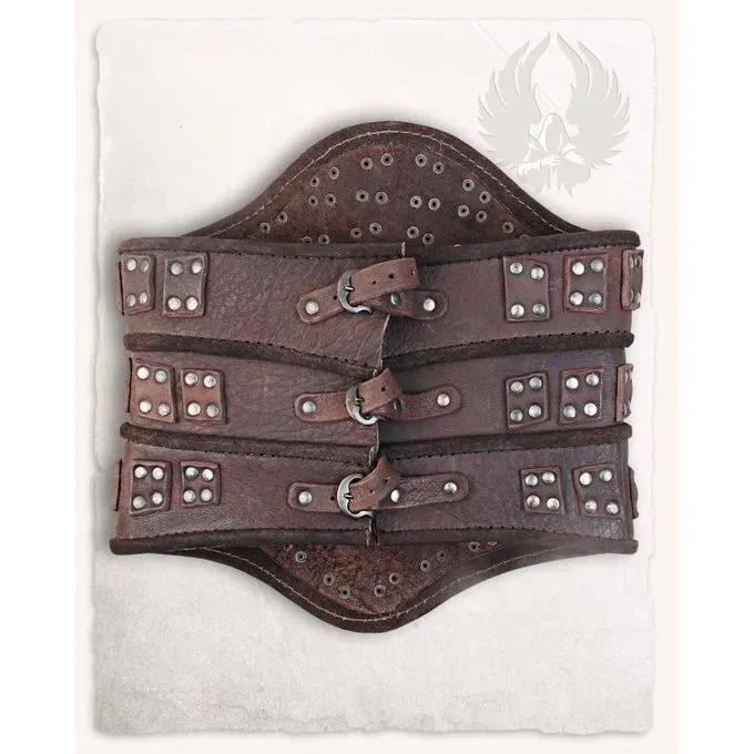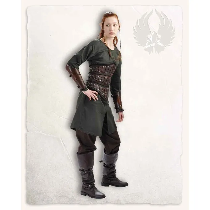 The Evandra corset is made of comfortable soft upper leather and closes at the back with three buckles. The piped seams at the bottom, top and the two in the middle give a nice accentuation to the waist. The riveted leather scales make the wearer look like a real warrior. Perfect for a LARP gathering or a medieval festival.