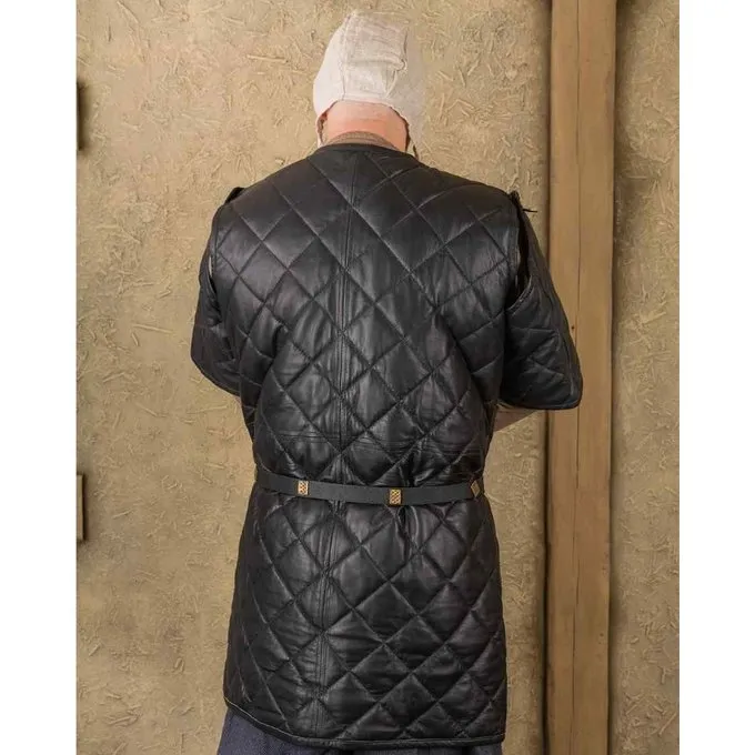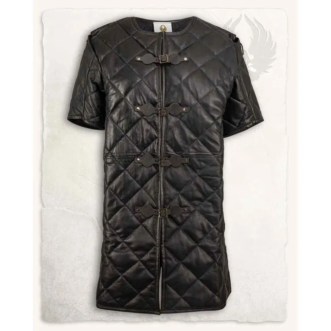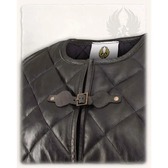 The “Haldur” gambeson is a leather gambeson based on a historical model. The upper layer is made of fine sheep leather, it is thickly padded to offer the wearer some protection and as a special feature has detachable sleeves, with which it can easily be converted into a leather tabard. The elaborate diamond quilting underlines the martial character of this unusual armor gambason. “Haldur” is closed on the chest with 4 cast brass buckles. It is particularly suitable for depicting Vikings, warriors, rangers, dwarves and many other combative races and characters.