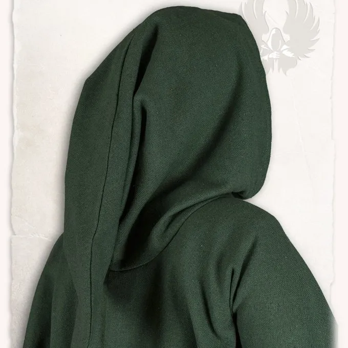 This cape is suitable for re-enactment, cosplay and LARP. The cape is made of canvas. This mid-length cape is perfect for battles and creating layers in your costume. The front of the cape is shorter, this gives the wearer even more freedom of movement. The cape can be closed with a button.