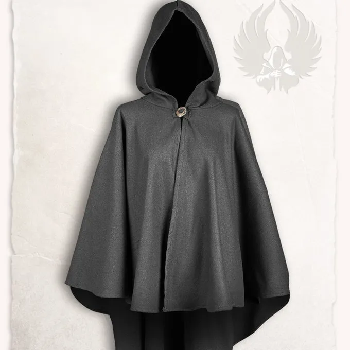This cape is suitable for re-enactment, cosplay and LARP. The cape is made of wool. This mid-length cape is perfect for battles and creating layers in your costume. The front of the cape is shorter, this gives the wearer even more freedom of movement. The cape can be closed with a button.