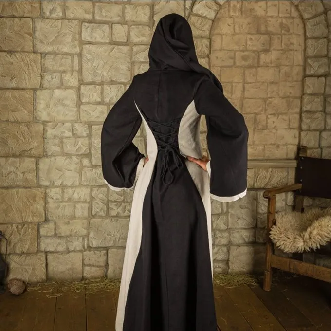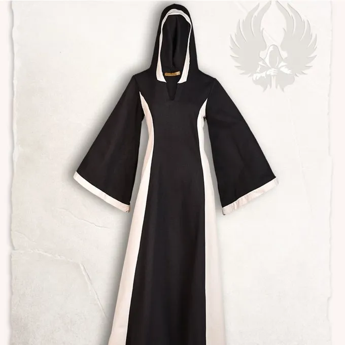 This dress is suitable for reenactment, cosplay and LARP. The dress is made of sturdy canvas. The dress has a hood and wide sleeves, which gives it a perfect look for festivals.