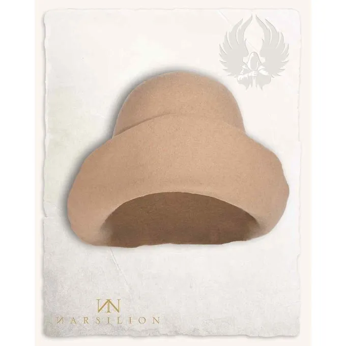 This Medieval felt hat is a typical headgear of the High and Late Middle Ages and was worn by both women and men of almost all social classes. One of the most common ways of wearing it is to fold it up at the front and then decorate the folded up (inner) part with fibulae, badges or embroidery.