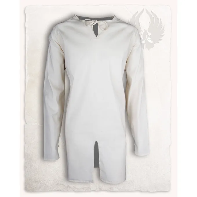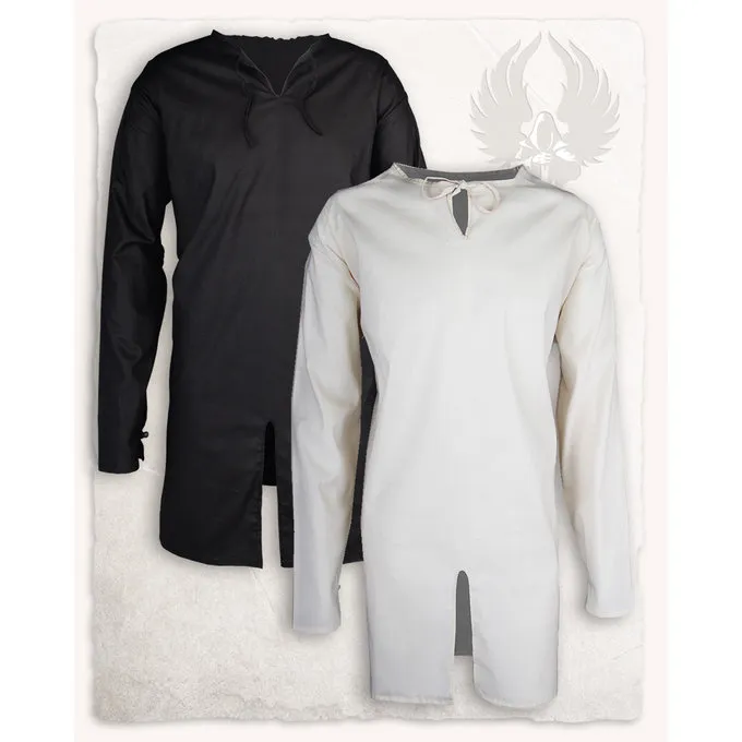 This tunic is suitable for Viking re-enactment, cosplay and LARP. This tunic is made of thin cotton and is perfect as undershirt. The tunic has a long slit at the front, which gives the wearer the freedom to move easily. The tunic is bell-shaped under the belt. The tunic has a v-neck, which gives it an elegant appearance. The v-neck can be closed with two strings and the sleeves can be closed with buttons.