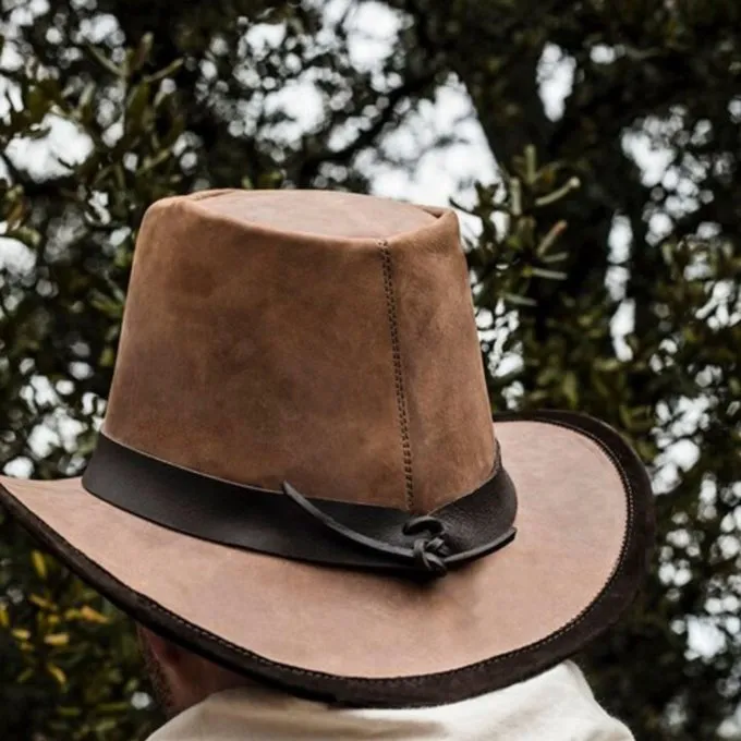 The hats from the Spanish manufacturer Rawblade are made of high-quality leather. Traditional craftsmanship and the highest quality standards guarantee a long service life and dimensional stability. A leather hat is a loyal companion in bad weather and an essential accessory for many costumes. This hat is perfect for reenacting pilgrims, 17th-19th century characters and wild west. The hat has a buckle at the front and a leather lace at the back.