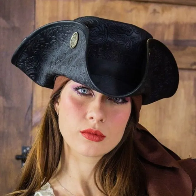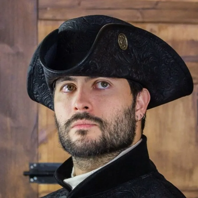 The hats from the Spanish manufacturer Rawblade are made of high-quality leather. Traditional craftsmanship and the highest quality standards guarantee a long service life and dimensional stability. A leather hat is a loyal companion in bad weather and an essential accessory for many costumes. The Three Doubloons hat is a good choice for characters such as fortune seekers, adventurers and villains. It is a characteristic headgear that tells stories about many a journey and adventure. This is the deluxe version of the Three Doubloons hat, with an ornate motif decorating the leather. Leather is a natural product and can absorb dyes in different ways. The actual shade may differ from the image.