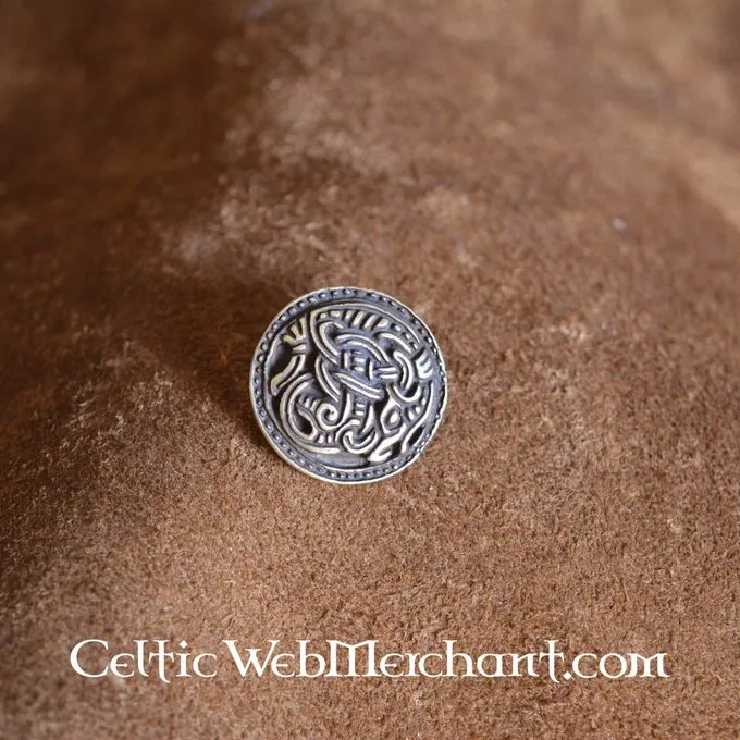 This belt fitting is based on a 9th century historical original excavated in Hordaland, Norway. It is made in the Borre style (825-970). It is not only suitable decorating belt straps, you can also use it to decorate bags. The fitting measures 2,4 cm and it is bronze coloured.