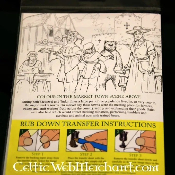 This set consists of a rub down panorama in A4-size, with a colouring plate and English instructions at the back.
