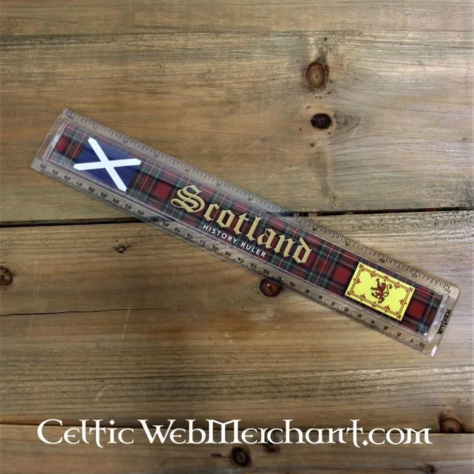 This plastic ruler shows the Royal Stuart tartan, Ramped Lion and the Cross of St Andrew. The back has a chronological timeline with the Scottish kings and queens and the periods of their reign.