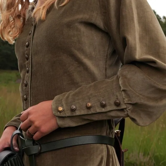 This beautiful cotehardie is made of velveteen and has a very luxurious appearance, suitable for re-enactment and LARP of noble and wealthy historical figures and characters. Velvet emerged in Europe during the 14th century and was woven mainly in Italy. For the medieval Burgundians, velvet garments symbolized prosperity and prestige and were highly fashionable.