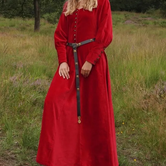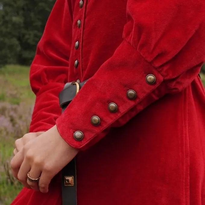This dress is based on originals from around the 13th-15th century. Dresses from this period are depicted in large numbers in medieval illuminated manuscripts such as the Tres Riches Heures du Duc de Berry. This type of dress is also called cotehardie. Typical for the cotehardie is that it increasingly shows the female shapes, in contrast to the rather shapeless dresses in the previous centuries. The cotehardie emphasizes the waist and bust because of the laces and buttons on the front, which allowed ladies to wear their dresses tighter. The neckline was also cut deeper and deeper. The cotehardie was often combined with a slip dress, a belt and a bonnet.