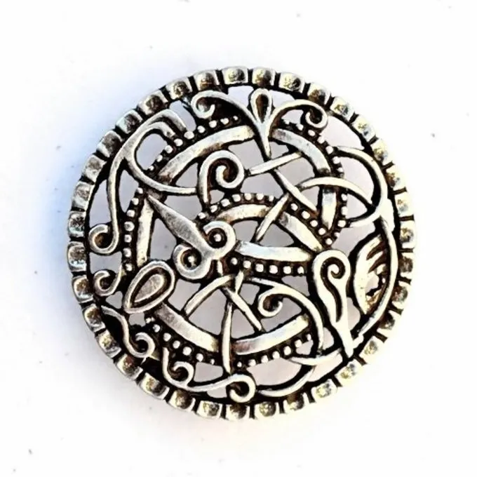 This fitting is based on the Pitney brooch. The original can be found in the British museum and dates from the late 11th century. It is made in the Urnes style. The fitting can be fastened to a bag or a wide belt.
